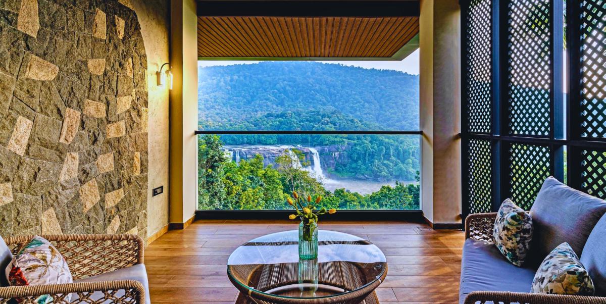Perched beside the timeless Athirappilly Falls, where rivers weave love songs through emerald forests and the mist rises like a ve..