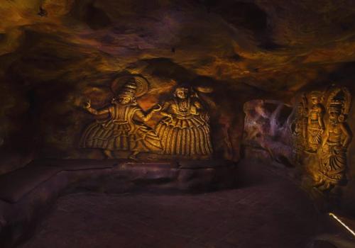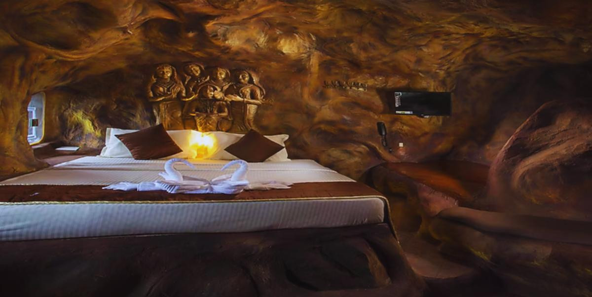 Step into your hidden sanctuary in Vagamon, where the mountains rise in misty silence and nature whispers its secrets through every breeze. Carved like a dream into the heart of the earth, your cave-style honeymoon suite is a world designed for two — a place where love feels timeless, intimate, and eternal. From the wide opening that frames the rolling hills, watch the valleys wrap themselves in morning mist, the peaks glowing like guardians of your love story.