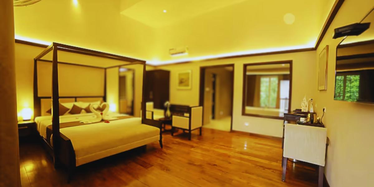 Escape into the arms of nature and romance at our enchanting honeymoon suite in Munnar, where love finds its perfect setting. Nestled amidst lush hills and misty skies, your stay here is graced with a private bathtub, creating intimate moments with views of green serenity. Step outside to discover a natural pond that mirrors the sky, a serene swimming pool to unwind together, and paddle-boat rides that add playful charm to your days. Rejuvenate at the in-house spa or realign your energies with yoga and meditation camps, designed for soulful connection.