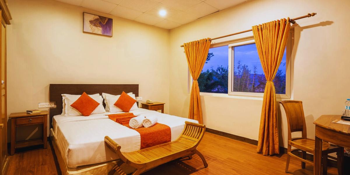 Nestled on a serene hillside, your cottage opens to a private balcony that frames sweeping views of mist-kissed valleys and sunlit mountain peaks. Handcrafted with warmth and romance in mind, the space blends rustic wooden charm with modern comforts — a sanctuary designed for quiet laughter, tender glances, and the joy of togetherness. From the first blush of sunrise to the golden glow of dusk, every moment here becomes a picture painted by nature itself.