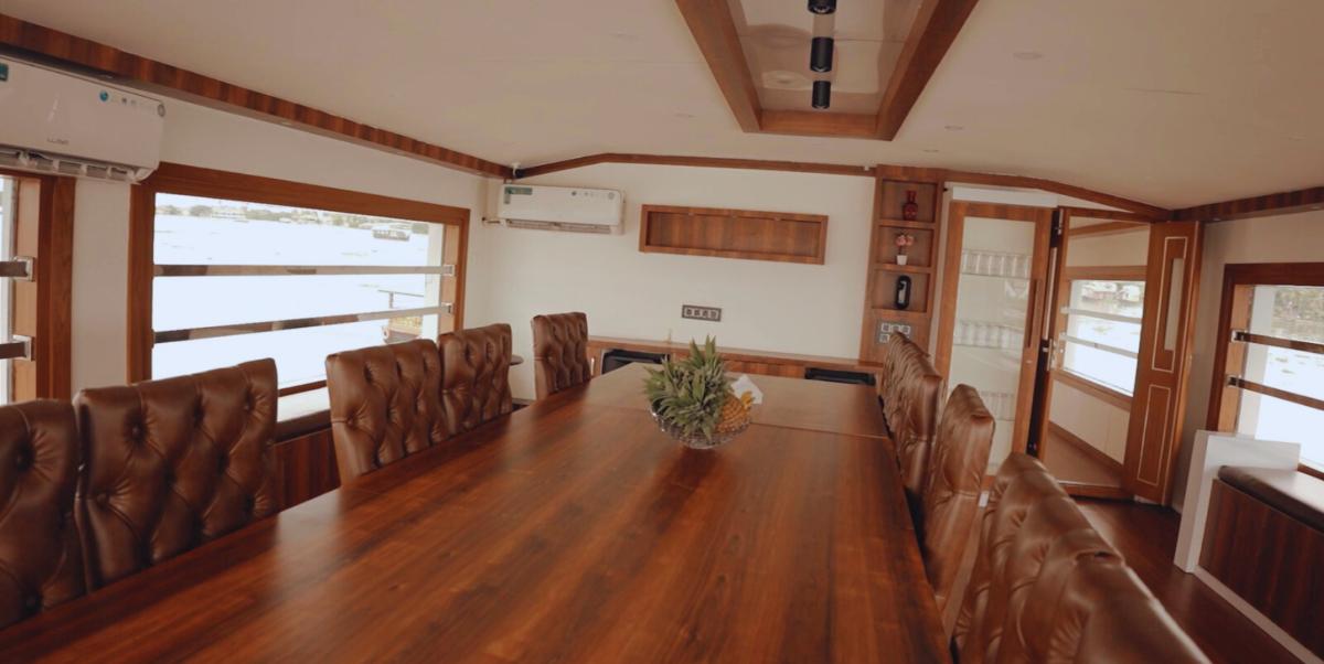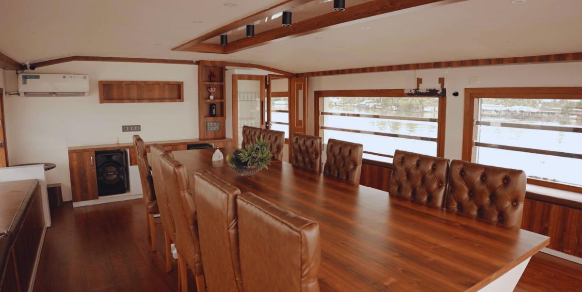 Step aboard a grand 4-bedroom luxury Kerala houseboat — where timeless craftsmanship meets modern indulgence, and life flows to the gentle rhythm of the backwaters. Designed for families and groups, this floating retreat offers spacious, air-conditioned bedrooms, polished wooden interiors, and an open terrace balcony with seating — the perfect spot to soak in sweeping views of the river and lush landscapes beyond.