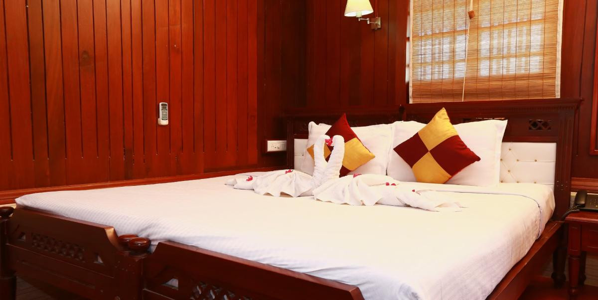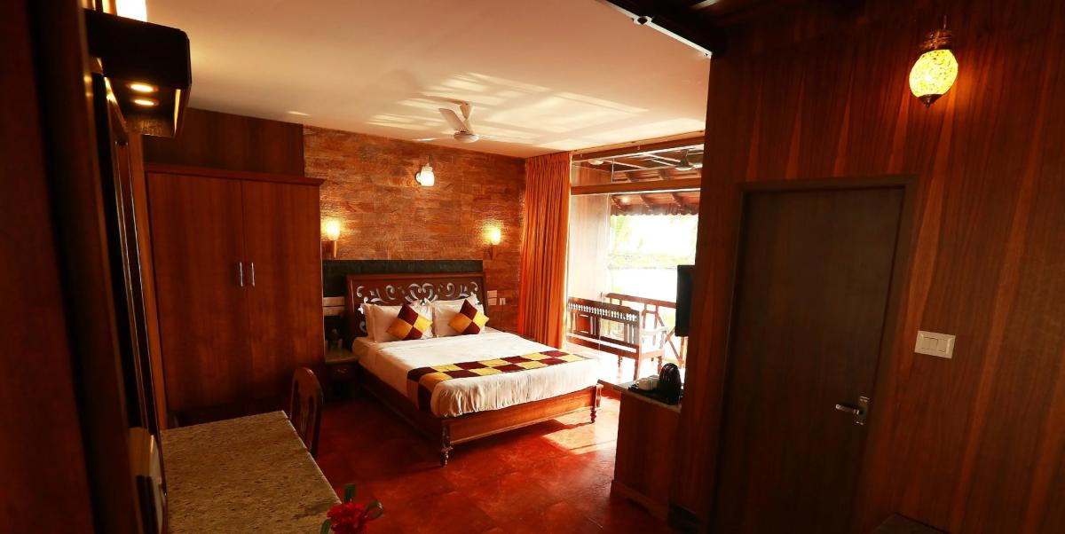 Escape to a traditionally styled honeymoon suite in Alappuzha, where timeless charm meets serene lakeside beauty. Designed with authentic Kerala aesthetics, this romantic retreat features elegant wooden furnishings, warm lighting, and a private open shower space that blends nature with luxury. The suite opens up to calming lake views, offering couples a peaceful and picturesque setting to relax, reconnect, and celebrate love.