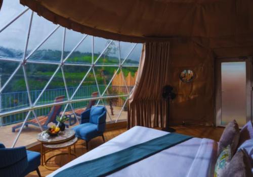 Inside, soft candlelight shimmers across the curved dome, rose petals trail toward a flower-adorned bed, and a chilled bottle of sparkling bliss waits to celebrate your forever. From the comfort of your private retreat, gaze through sweeping glass walls that frame the misty mountains and endless skies, turning every view into poetry.