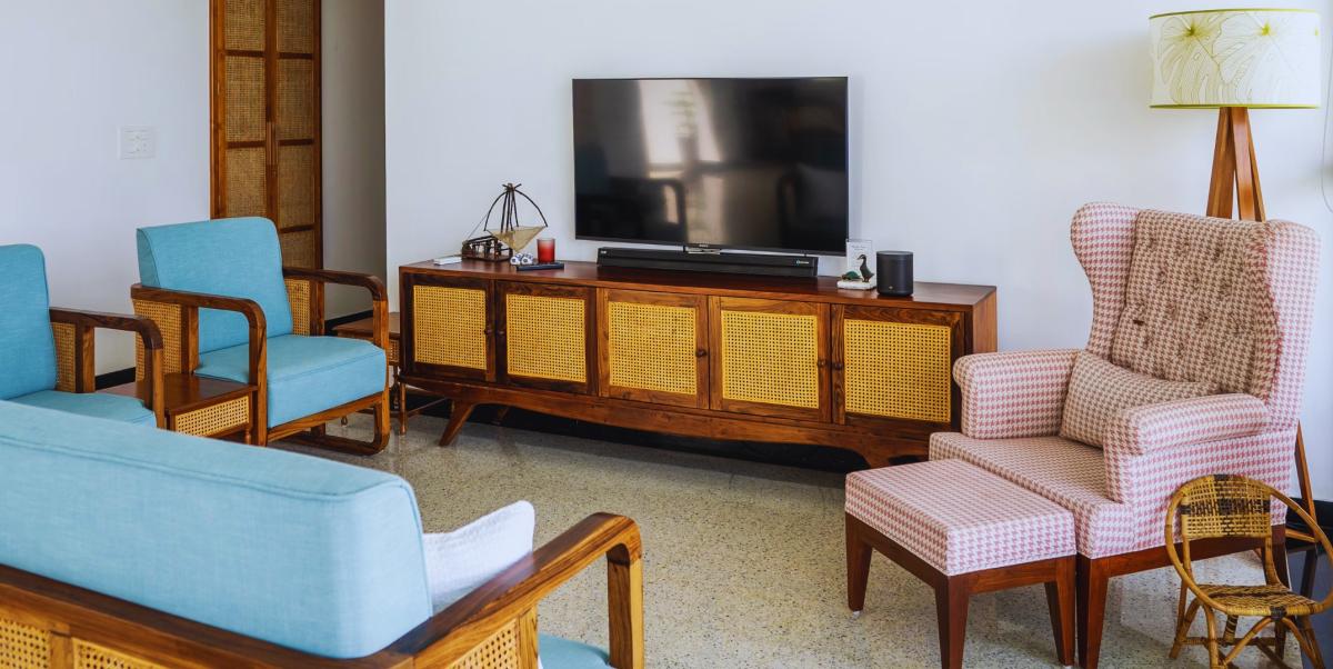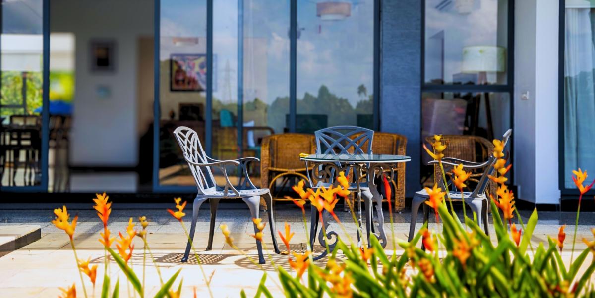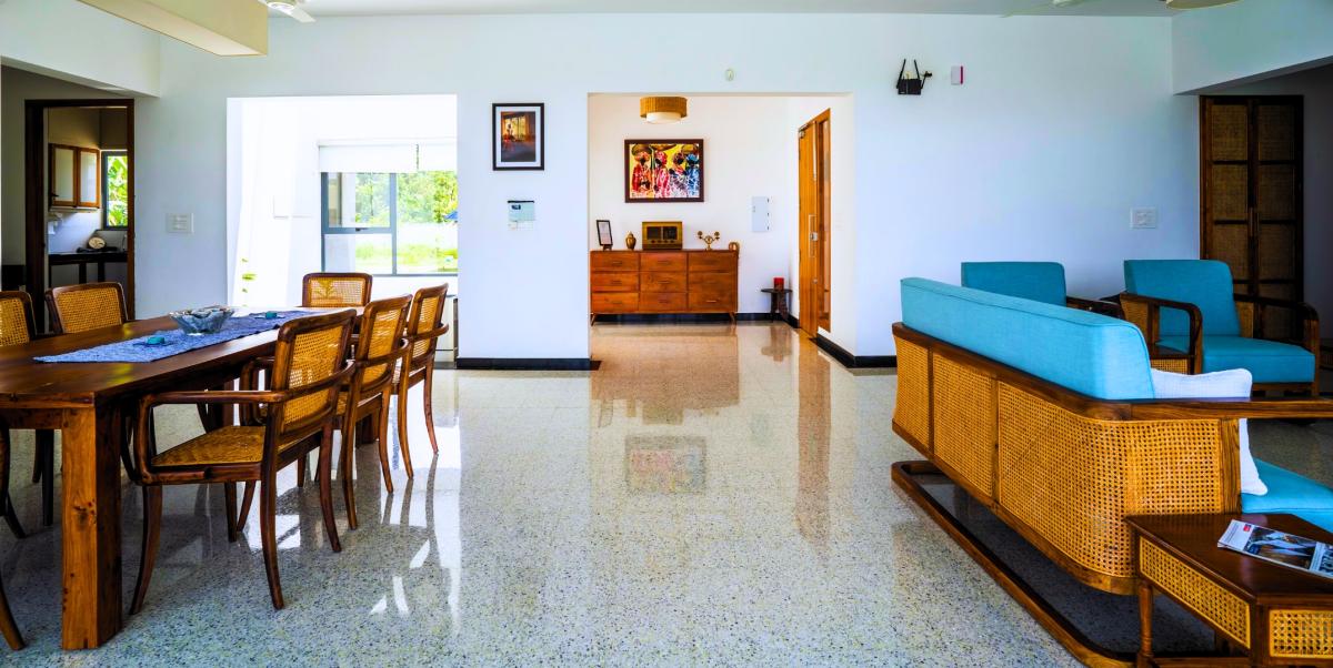 Inside, the villa is fully air-conditioned and beautifully appointed. Each of the three spacious bedrooms comes with a private washroom, ensuring convenience and style. The living room, adorned with chic furnishings, a flat-screen TV, and a dining area, opens to sweeping river views—turning every moment into a postcard-worthy experience.
