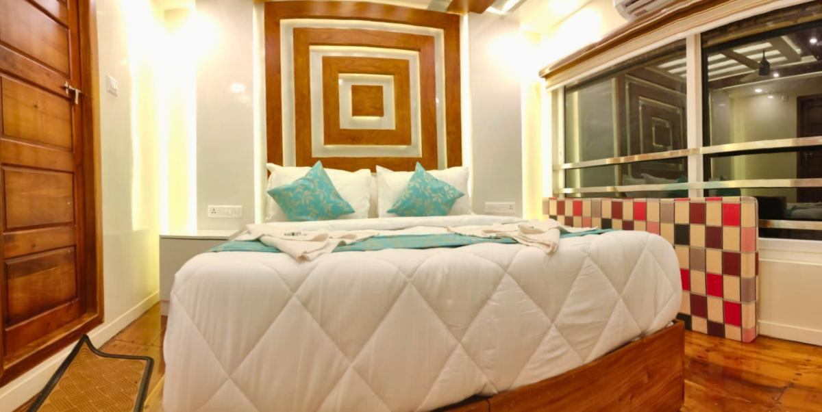 At its heart is a full glass-covered lobby — a radiant space where natural light dances through dawn to dusk, offering uninterrupted views of the glistening waters and whispering palms. The terrace balcony, perched above, invites you to bask in panoramic vistas — whether it’s golden sunrise reflections or moonlight shimmering on still lagoons. Inside, each of the ten private suites is a statement of refined comfort — spacious, serene, and styled with handcrafted elegance. Every room opens to changing sceneries: emerald paddy fields, swaying coconut canopies, and the tranquil rhythm of backwater life.