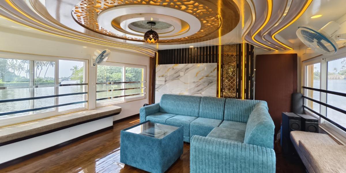 Begin your day with the sunlight spilling through the glass lobby, casting a golden glow over the polished interiors. Let time drift as you unwind on the viewing deck, lose yourself in a book beside wide glass panels, or sip a fresh tender coconut while listening to the hush of the water. As dusk sets in, delight in an authentic Kerala-style seafood dinner prepared by your onboard chef — from the beloved Karimeen Pollichathu to fresh, locally inspired dishes crafted with heart. As stars rise over the still waters, feel the world slow around you — where every ripple carries serenity and every night holds the promise of peace.